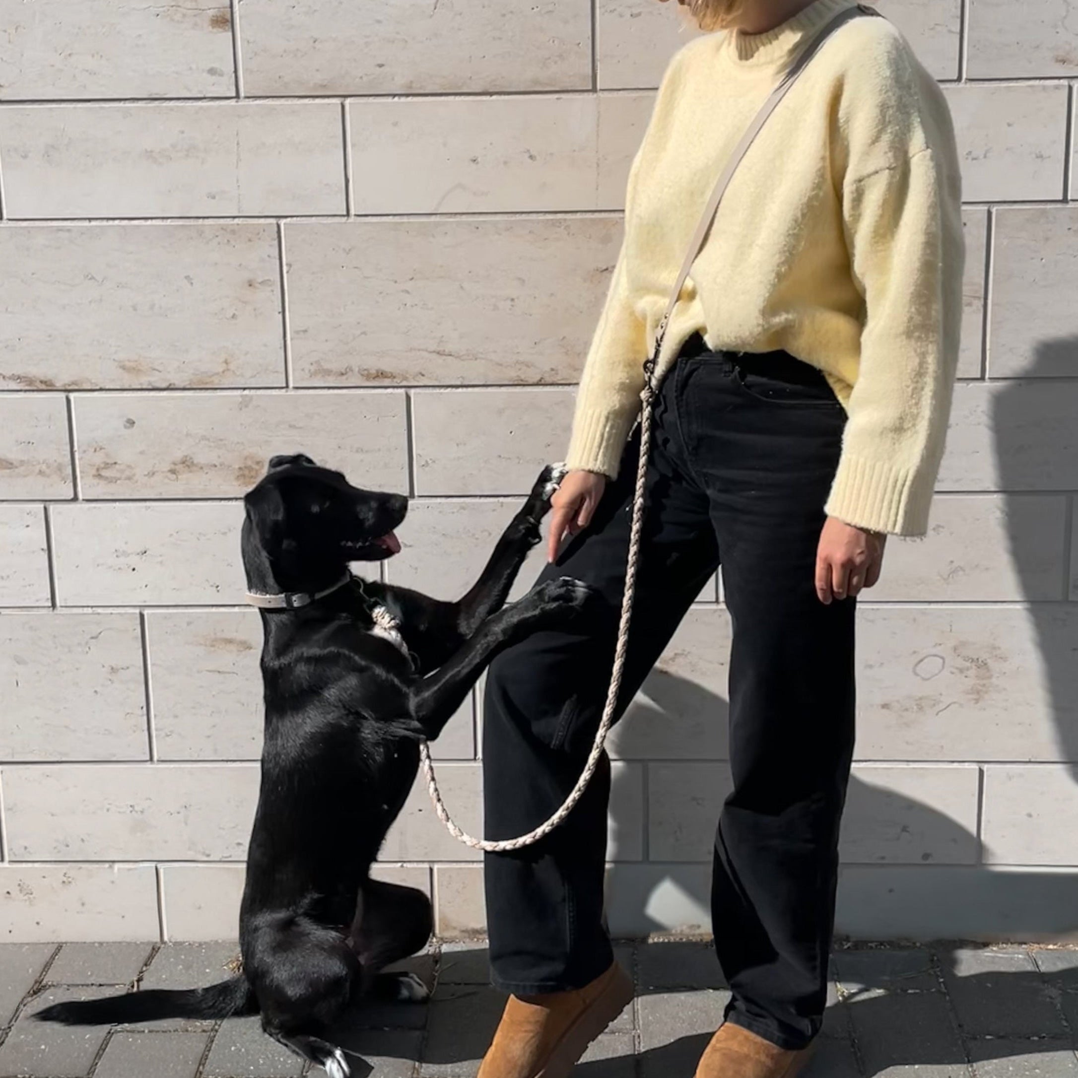 Unsere elegante HandsOff-Leine in Beige vereint minimalistischen Stil mit höchstem Komfort und Funktionalität. Mit einer Gesamtlänge von 2,20m oder 2,60m bietet sie maximale Flexibilität für entspannte Spaziergänge , ob umgehängt, halbiert oder klassisch mit Handschlaufe getragen.