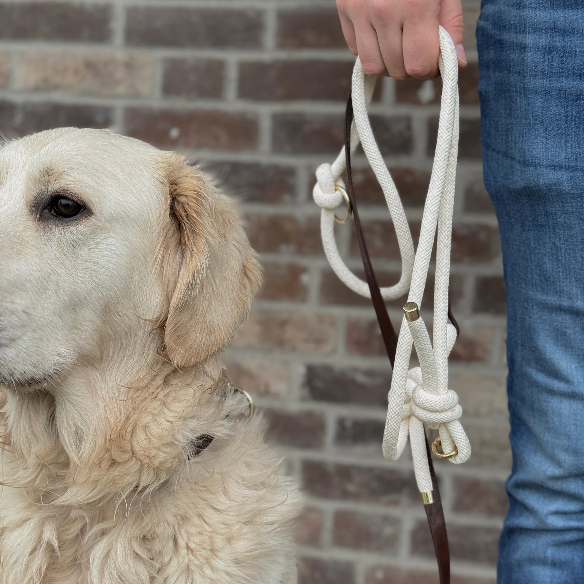 Das Tau dient als bequemer Umhängeteil und liegt dank seines geringen Gewichts angenehm auf der Schulter. Der Biothane-Abschnitt bildet die Verbindung zum Hund und sorgt für Stabilität, Langlebigkeit und eine edle Optik.