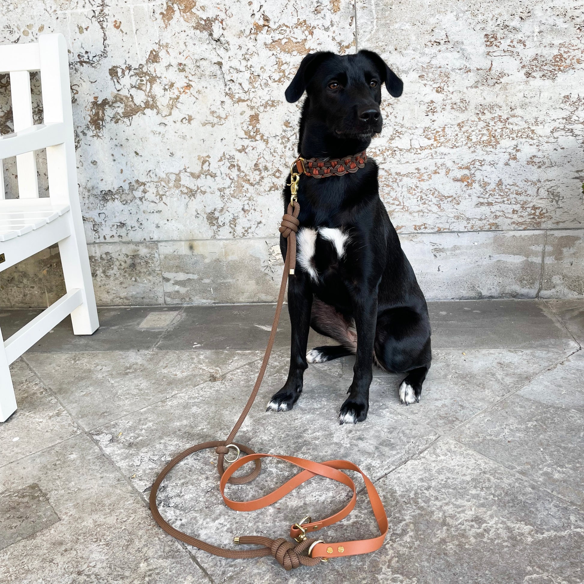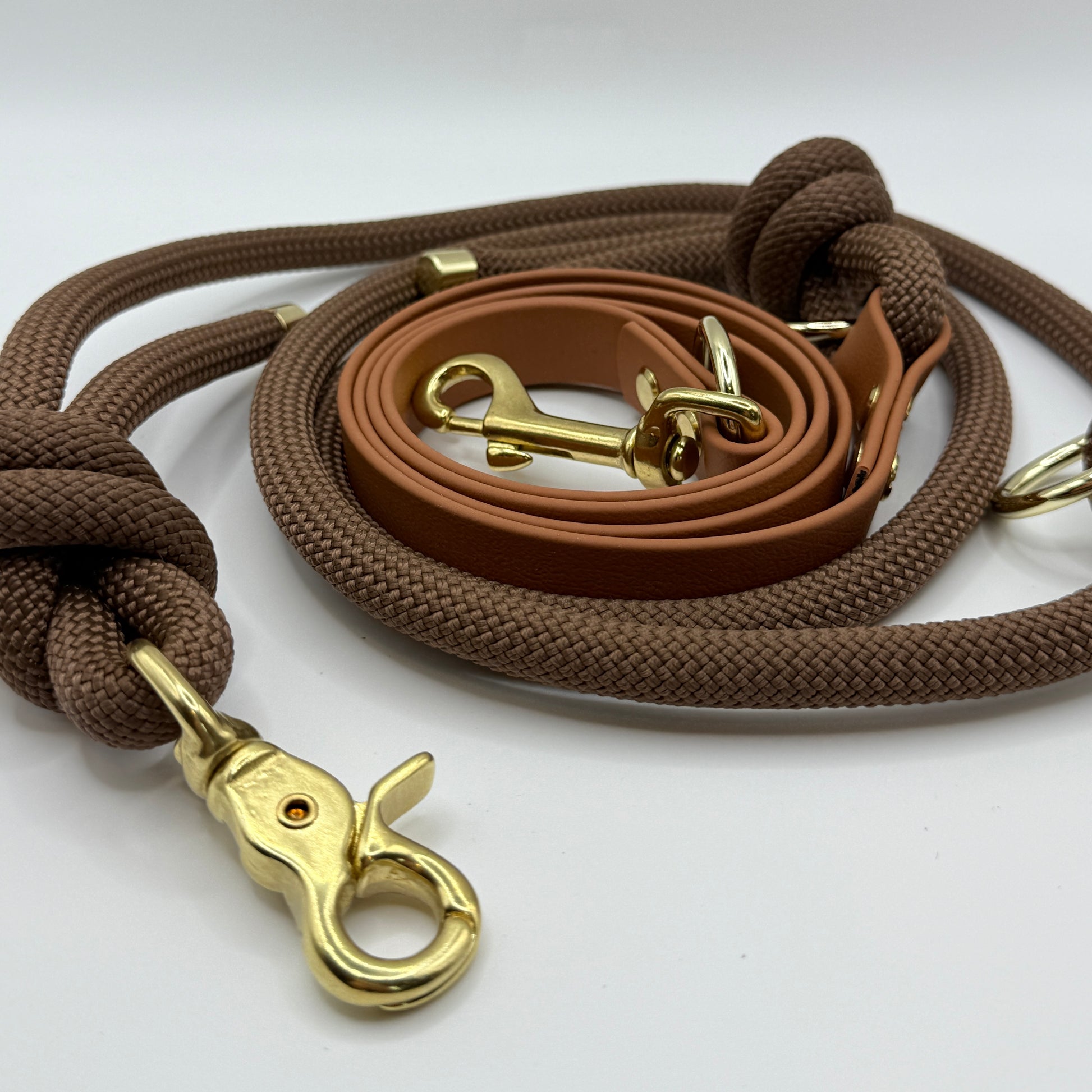Unsere Noa Brown Leine kombiniert PPM-Seil und Biothane zu einem eleganten Alltagsbegleiter in warmen Brauntönen, perfekt passend zum gleichnamigen Halsband.