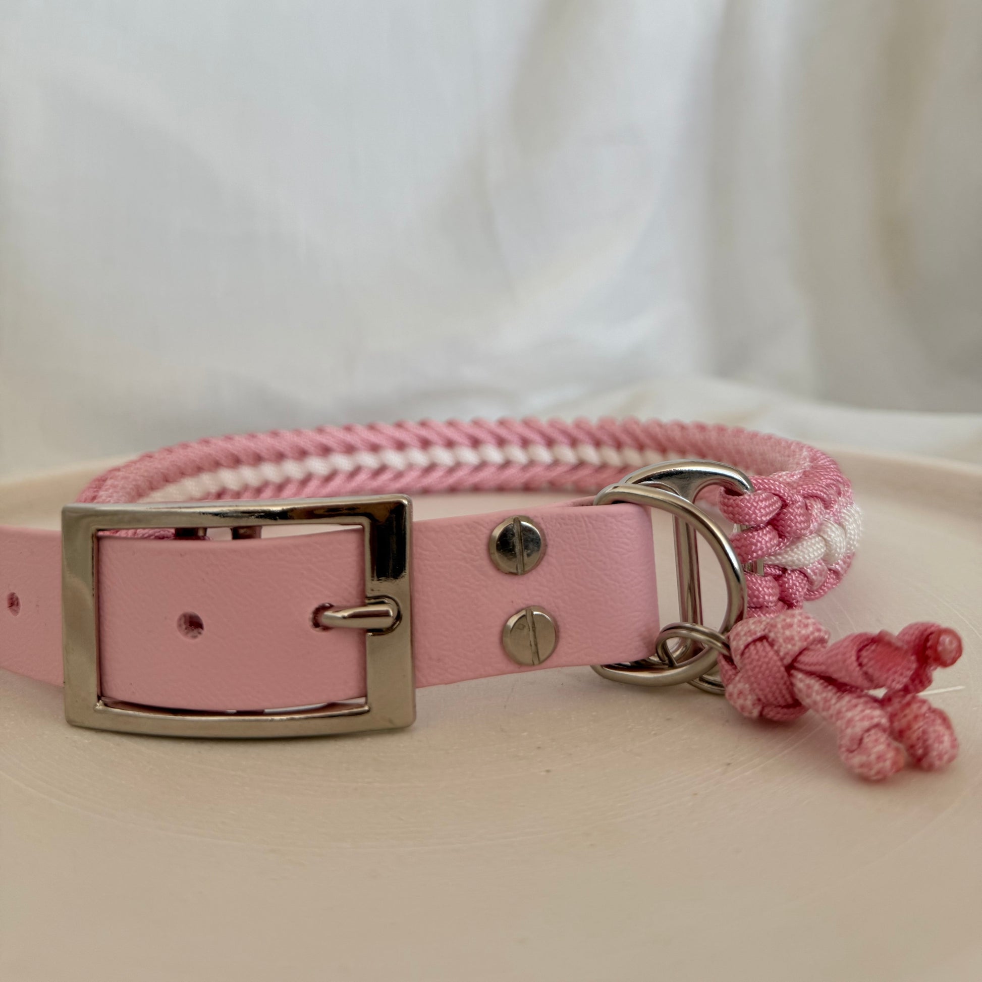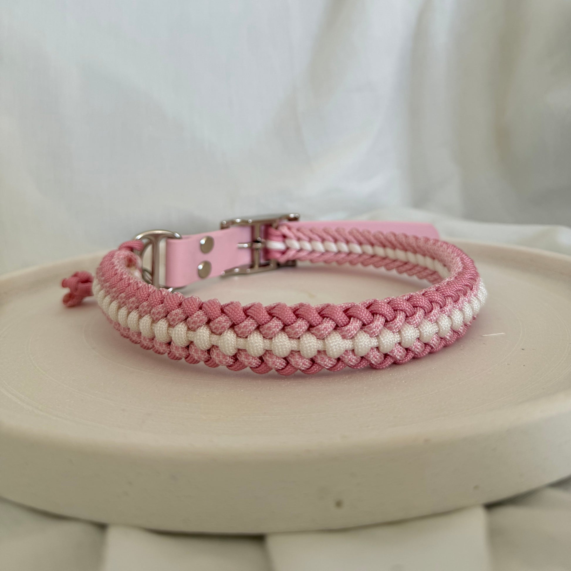 Dieses handgefertigte Halsband kombiniert Stil, Komfort und Langlebigkeit. Das geflochtene Paracord sorgt für Stabilität und ein angenehmes Tragegefühl, während der hochwertige Biothane-Adapter wasserfest und pflegeleicht ist. Die harmonische Farbkombination aus Rosa und Weiß verleiht dem Halsband einen eleganten Look – perfekt für modebewusste Vierbeiner!