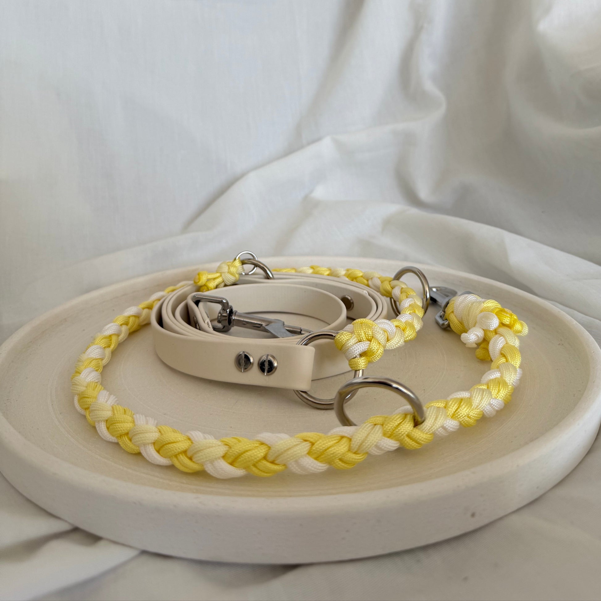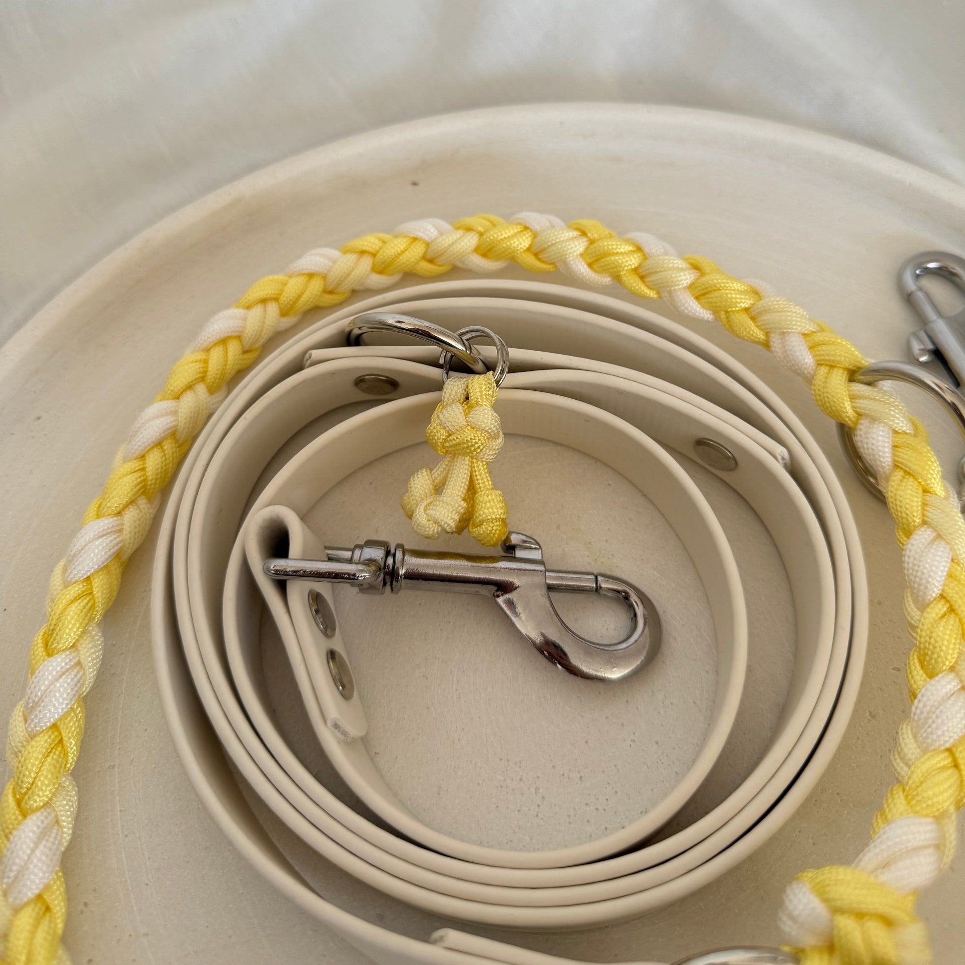 Unsere hochwertige „HandsOff“ Leine vereint modernes Design mit maximaler Flexibilität. Das geflochtene Paracord sorgt für Stabilität und ein angenehmes Tragegefühl, während der wasserfeste Biothane-Abschnitt für Langlebigkeit und einfache Pflege steht. Die elegante Farbkombination aus Gelb und Weiß macht die Leine zum stilvollen Accessoire für deinen Vierbeiner.